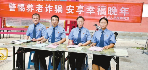 近日,河北省广平县检察院组织检察官走进辖区十里铺镇金安村,开展防范养老诈骗法治宣传活动。检察官结合一个个真实案例,剖析犯罪分子的惯用手法和作案方式,深入浅出地介绍“健康养生型”“投资理财型”等养老诈骗常见类型,提醒老年居民遇事多与子女商量,别轻易向陌生人汇款,守护好自己的“钱袋子”。“看了你们的宣传册,我算知道了,以后碰到说可以免费领礼品,最后让你掏钱买保健品、投资养老项目的,十有八九都是骗子。”活动现场,一位老人跟检察官总结他的学习心得。