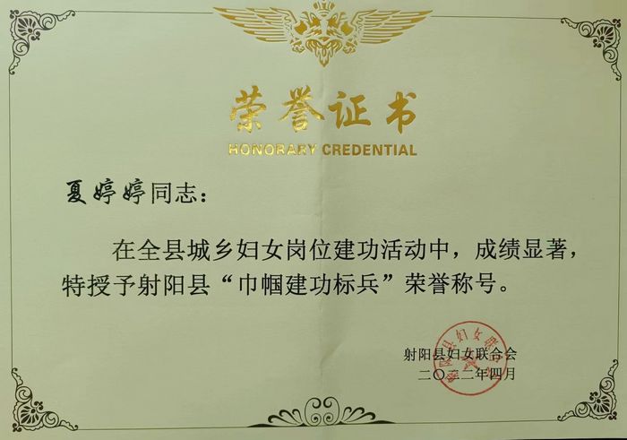 近日,射阳县检察院干警夏婷婷被该县妇联授予“巾帼建功标兵”荣誉称号。